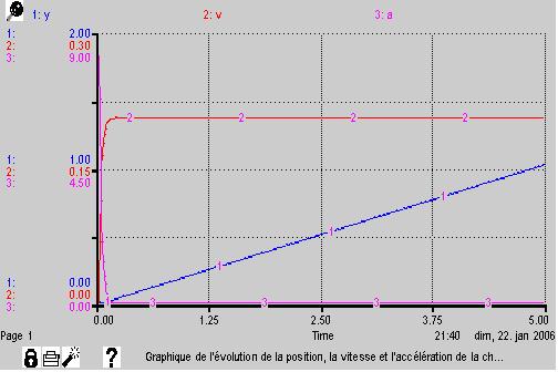 Cliquez sur le petit graphique rose puis cliquer quelque part sur votre feuille, ensuite cliquez deux fois sur le graphique, demandez un graphique « Time Series » afin de faire apparaître la position, la vitesse ainsi que l’accélération de la bille en fonction du temps. Cliquez deux fois sur « y », « v » et « a » pour les faire apparaître dans le tableau de droite. Cliquer sur ok puis sur « Run » et « Run », le graphique apparaîtra. Ensuite cliquez à nouveau sur « Run » et « Run specs… », à côté de « DT » mettez comme valeur 0,01 (pour affiner le pas) et en dessous de « Integration Method » sélectionnez « Runge-Kutta 4 » comme méthode de calcul (c’est la méthode de calcul la plus précise). Cliquez à nouveau sur « Run » et « Run », la version finale de votre graphique apparaîtra. (La position est exprimée en m, la vitesse en m/s, l’accélération en m/s2 et le temps en s).