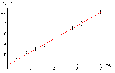 Vous mesurez le champ magnétique B au centre d’un solénoïde de 1 m de longueur en fonction du courant I qui le parcourt et vous obtenez les valeurs suivantes :