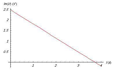 En reportant ln(U) en fonction du temps, on trouve une droite de pente $-\frac{1}{\tau.}$