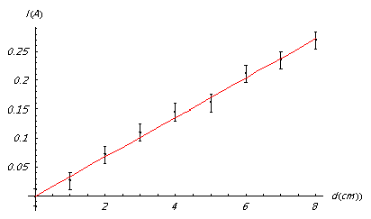 En reportant le courant nécessaire pour équilibrer une balance de Laplace en fonction de la position du contrepoids, on obtient une droite :
