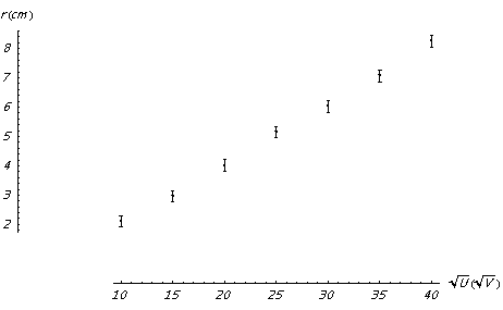 En reportant r en fonction de $\sqrt U$, on obtient donc une droite dont la pente permet de trouver le rapport charge sur masse de la particule :