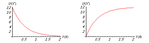 2. La constante de temps $\tau$ correspond au temps après lequel la tension vaut $\frac{U_0}{e}$ lors de la décharge et à $U_0(1 - \frac{1}{e})$ lors de la charge du condensateur. Après un temps $\tau$, la tension aux bornes du condensateur vaut donc grosso modo 63% de la tension du générateur lorsqu’il se charge et 37 % de sa tension initiale lorsqu’il se décharge.