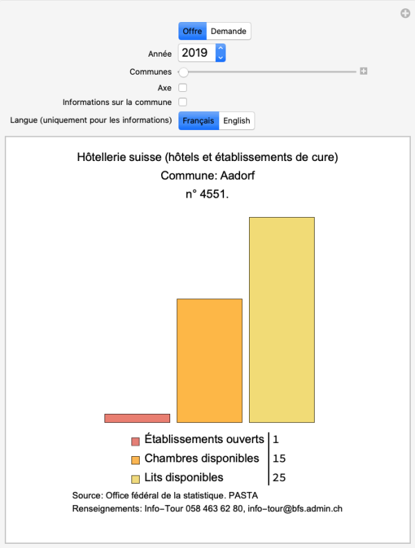 Hôtellerie suisse : hôtels et établissements de cure. Offre et demande des établissements ouverts par commune.