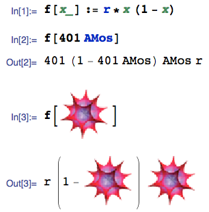 peut être n’importe quelle expression, que nous représentons, dans le membre de droite, par le nom x. Cette règle dit : si f agit sur x, il faut remplacer x par r*x(1-x). Et tout ce que vous saisissez dans Mathematica est traité comme une expression : les formules mathématiques, les listes, les graphiques, etc.