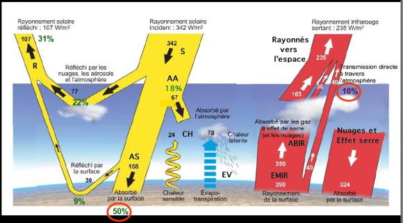 Cette émission vers l’espace ne se fait pas de manière directe, sauf pour une faible part, mais par l’intermédiaire de l’atmosphère qui joue donc un rôle essentiel dans les échanges d’énergie.