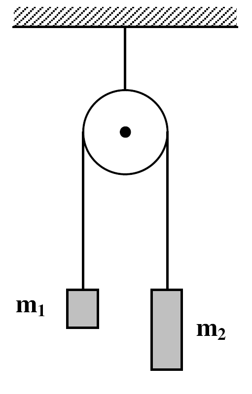 – a) Faites un schéma de la machine d’Atwood sur lequel vous représenterez toutes les forces qui s’y