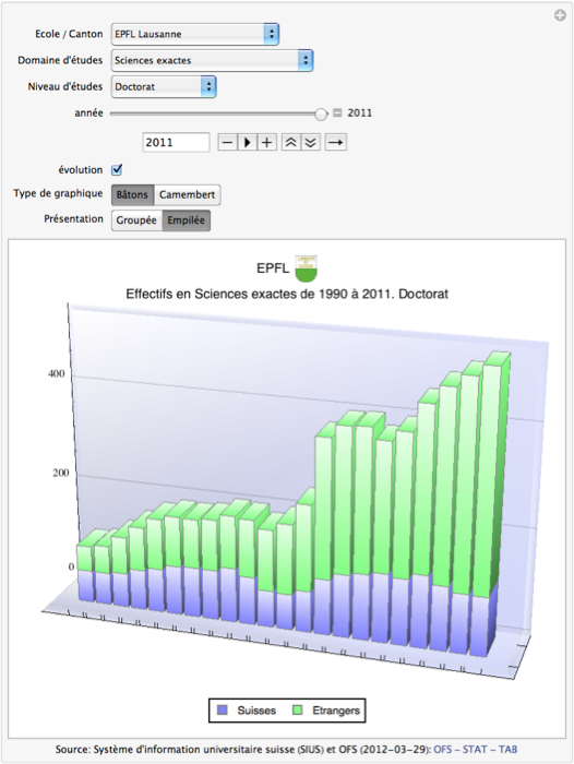 Niveau d’études atteint par les étudiants suisses et étrangers de 1990 à 2011 selon l’école et le domaine d’étude.