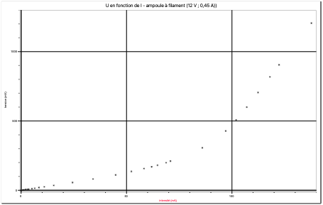 Nous voyons sur ce graphique que les points décrivent une courbe strictement croissante, traduisant ainsi une relation non linéaire entre la tension et l’intensité.