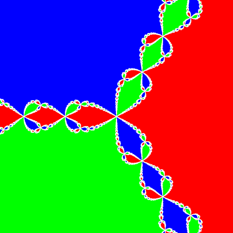 - Trois bassins d’attraction (symétrie à 120°). Le rouge menant à $1$, le bleu à $\omega$ et le vert à $\omega^2.$ Si un point de départ $z_0$ est situé dans l’un de ces bassins, même s’il est très loin du centre, il finira par converger vers la solution associée au bassin.