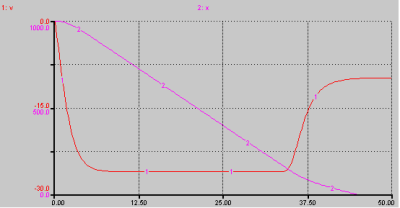 Nous avons donc la courbe en rose qui représente la position du parachutiste pendant son saut et la courbe en rouge qui représente la vitesse du parachutiste.
