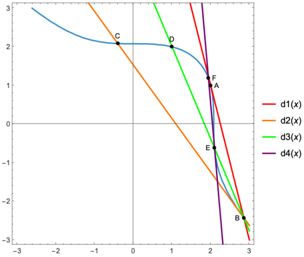 On relie le point $B$ (issu de la première tangente) au point $D(1,2)$, qui est une autre solution évidente. La droite $d_{3}$ coupe la courbe en un troisième point $E$.
