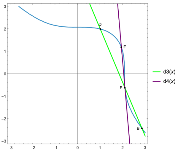 Pour continuer la construction, on trace la tangente $d_{4}$ à la courbe en $E$. Cette tangente recoupe la courbe en un point $F$, encore dans le premier quadrant (coordonnées positives). Les coordonnées $(F_{x}, F_{y})$ du point $F$ fournissent ainsi deux nouveaux nombres rationnels positifs satisfaisant $F_{x}^3 + F_{y}^3 = 9$.