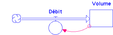 Pour ce fait, il faut tout d’abord créer un réservoir, que l’on nommera "Volume" puis y faire arriver un débit nommé "Débit", ensuite créer un lien partant du volume au débit.