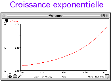 Pour que le graphique soit une courbe exponontielle, il faut donc que le volume augmente au fur et à mesure de plus en plus. Pour que le volume augmente exponentiellement, le débit doit être proportionnel au volume. Dès lors, il faut définir le débit par le volume (auquel on donnera comme valeur de départ : 1)