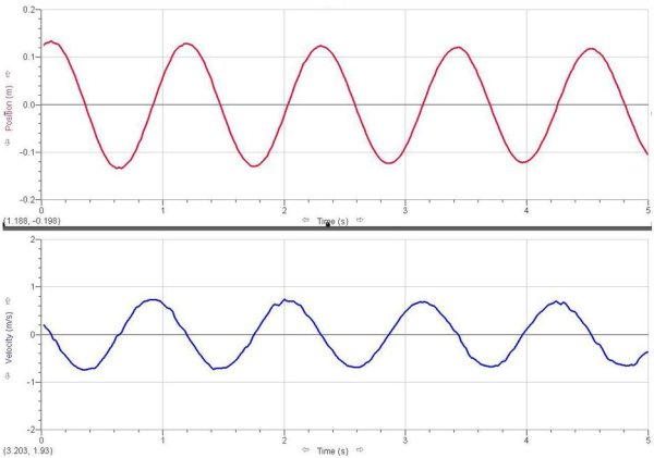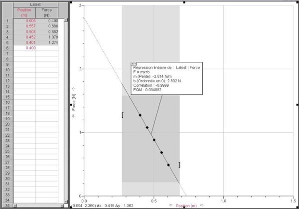 Nous avons utilisé le fichier Exp 17a avec une masse de 50 grammes accrochée à un ressort au dessus du capteur et en avons déduit la constante k du ressort.