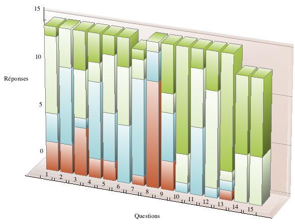 Les numéros des questions sont en abscisse et les réponses (N=15) en ordonnée. Les secteurs colorés donnent le nombre de réponses par degré de satisfaction (insatisfaisant, satisfaisant, bien, très bien, de bas en haut). N. B. Il manque une réponse à la question 7 et deux réponses aux question 14 et 15.
