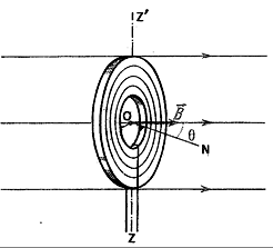 Une bobine de 200 spires de 10 cm de rayon, placée dans un champ uniforme d’induction B inconnue, est reliée à un galvanomètre balistique permettant de mesurer les quantités d’électricité induites dans la bobine. Sachant que la résistance du circuit ainsi réalisé vaut 200 Ω et qu’une rotation faisant passer l’angle θ de 0 à 90° produit une quantité d’électricité Q=3.14$\times$10-4 C, calculez l’induction B.