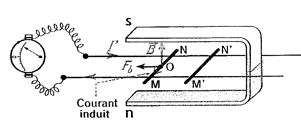 Un courant circulant dans une bobine y crée un champ magnétique. On peut se demander si un champ magnétique placé dans une bobine y ferait naître un courant. Relions les bornes d’une bobine à un galvanomètre et établissons un champ magnétique dans la bobine au moyen d’un aimant ou d’un électro-aimant. Nous constatons que le galvanomètre décèle un courant lorsqu’on établit ou qu’on supprime le champ magnétique, c’est-à-dire quand le champ varie, mais non quand le système est stationnaire. Ce courant est appelé courant induit. Ce phénomène se nomme phénomène d’induction.