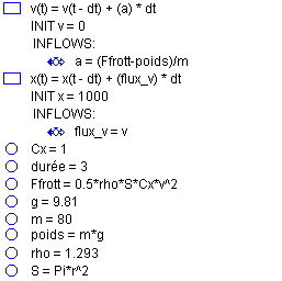 L’exercice consiste à trouver avec des données déjà définies, le temps maximal de l’ouverture d’un parachute sautant de 1000m. Pour se faire, nous allons utiliser Stella, un programme très adapté pour résoudre ces problèmes mathématiques.