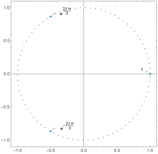 Chaque racine $1$, $\omega=e^{2\pi i/3}$, $\omega^2=e^{4\pi i/3}$ est un point fixe attractif (racines simples) ; il y a convergence quadratique dès que l’on est suffisamment près.
