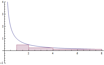 Pour démontrer cela, on considère des rectangles sous la courbe de $\frac{1}{x}$ construits ainsi :