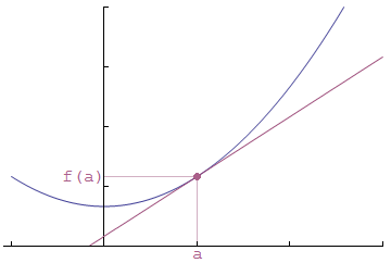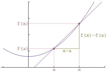 La fraction est la pente de la droite passant par le point $a$ et le point $x$. À la limite, quand $x$ tend vers $a$, la droite devient tangente au point $a$.