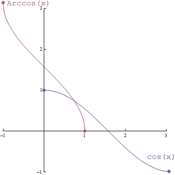 $\begin{eqnarray*} Arccos : [-1 ; 1] & \rightarrow & \left[\,0 ; \pi \right] \\ x & \mapsto & Arccos(x) \end{eqnarray*}$
