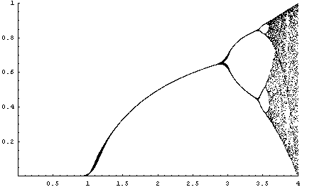 Le diagramme ci-dessus n’est cependant pas exact. On voit clairement qu’aux alentours de 1, ainsi qu’à certaines bifurcations, il n’y a pas un mais plusieurs points très proches. Les points fixes pour $r=1$ ou $r=3$ sont des limites qui ne peuvent être atteintes qu’après un grand nombre voire un nombre infini d’itérations, ce que ne peut faire Mathematica. Pour ces paramètres, le système possède une longue phase transitoire.