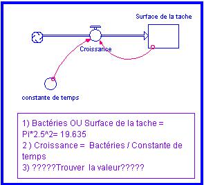 Le réservoir représente la surface occupée par les bactéries (nous supposons que le nombre de bactéries est proportionnel à cette surface). Le flux donne l’augmentation de la surface par heure, et la constante de temps mous indique après combien de temps la surface a été multiplié par le nombre e = 2.72