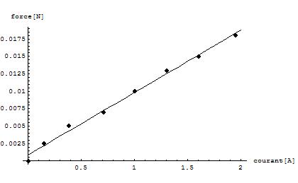 Pour calculer le champ B, il faut remplacer k dans l’équation de la droite f = k . i par l . B. Et ainsi nous obtenons l’équation suivante : f = l . B . i. De la nous pouvons déduire que le champ B = f / l . i. Le champ magnétique B n’a pas la même valeur pour tous les points de mesure car la force de Laplace ne varie pas proportionnellement à i à cause des erreurs de mesures sur i. Nous avons donc pris la pente de la droite du graphique qui vaut 0,00894 et nous la multiplions par par 1/l. Et nous obtenons :