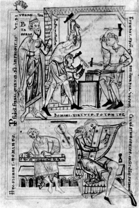 Selon une légende rapportée par Nicomaque au IIe siècle de notre ère, « un jour, Pythagore se promenait en réfléchissant aux problèmes de la consonance, et cherchait s’il ne pouvait imaginer pour l’oreille un secours analogue à celui que possède la vue avec le compas ou la règle, le toucher avec les balances ou les mesures. Il vint à passer, par une coïncidence providentielle, devant un atelier de forgeron et entendit très distinctement des marteaux frappant sur l’enclume et donnant des sons consonants entre eux, à l’exception d’un seul couple. Rempli de joie, il entra dans l’atelier comme si un dieu secondait son dessein, et par des expériences variées, reconnut que c’était la différence de poids qui causait la différence de son, et non l’effort des forgerons, ni la force des marteaux. Il releva avec soin le poids des marteaux et leur force impulsive, puis rentra chez lui. Il fixa alors un clou unique dans un angle de la muraille, pour éviter que deux clous différents, ayant chacun leur matière propre, ne faussent l’expérience. A ce clou, il suspendit quatre cordes semblables par la