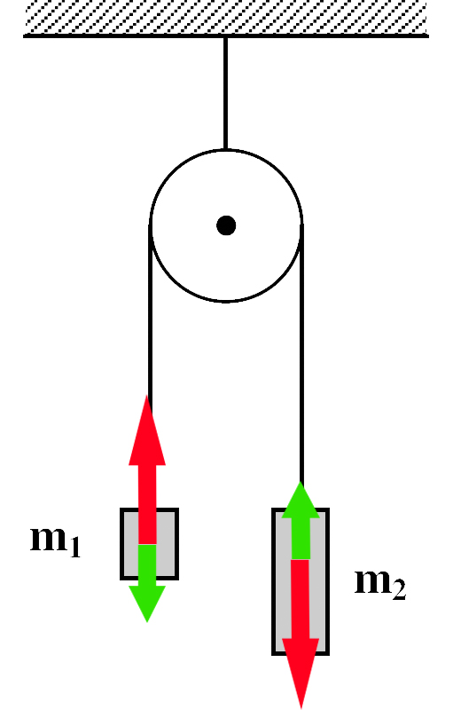 – a) Faites un schéma de la machine d’Atwood sur lequel vous représenterez toutes les forces qui s’y