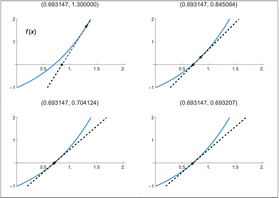 Zéro exact : $x^*=\ln 2 \approx 0{,}69315$. Après trois itérations : $|x_3 -x^*| \approx 6\times 10^{-5}$.