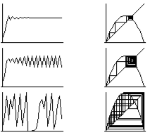 Evolutions conduisant à l’équilibre (première ligne), à un cycle périodique (deuxième ligne) ou au chaos (troisième ligne). Les graphiques de la première colonne donnent l’évolution temporelle, ceux de la deuxième illustrent la méthode graphique d’itération.