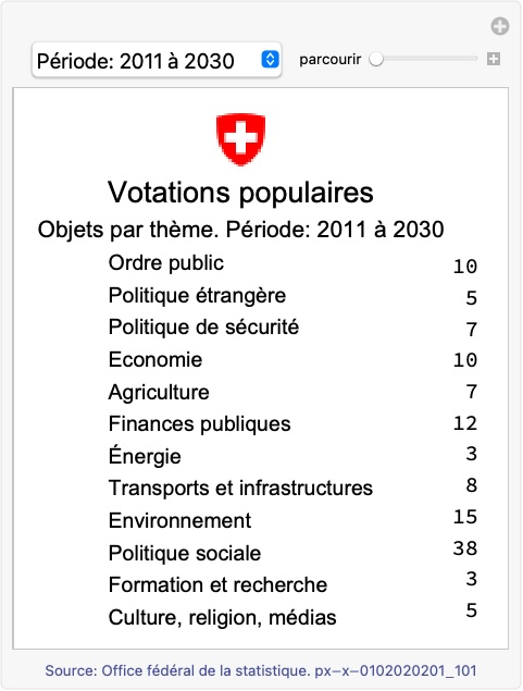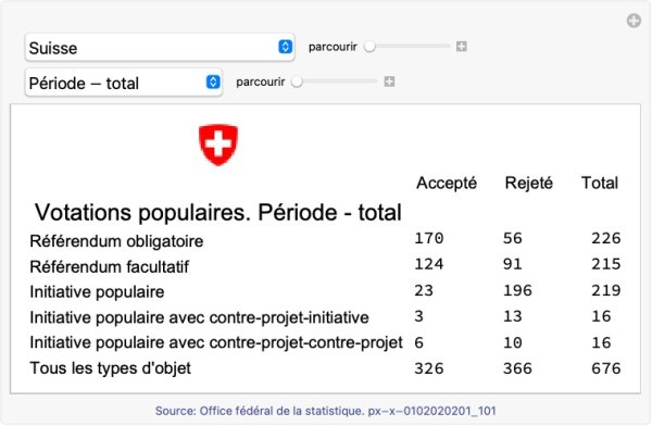 Le système de votation en Suisse repose sur des mécanismes de démocratie directe qui permettent aux citoyens de participer activement aux décisions politiques. Bref résumé des possibilités et outil d’analyse des acceptations et des refus des objets proposés en fonction des années et des Cantons depuis 1848.