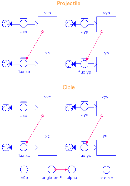Modèle permettant d’obtenir les horaires (position et vitesse) selon Ox et selon Oy du projectile et de la cible. L’abscisse initiale de la cible, l’angle de tir et la vitesse initiale du projectile peuvent être choisis librement, le projectile atteint toujours la cible.