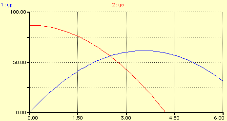 Les horaires de la position du projectile (en bleu) et de la cible (en rouge) sur Oy sont des paraboles. Lorsque le projectile et la cible se rencontrent, ils occupent la même position sur Oy.